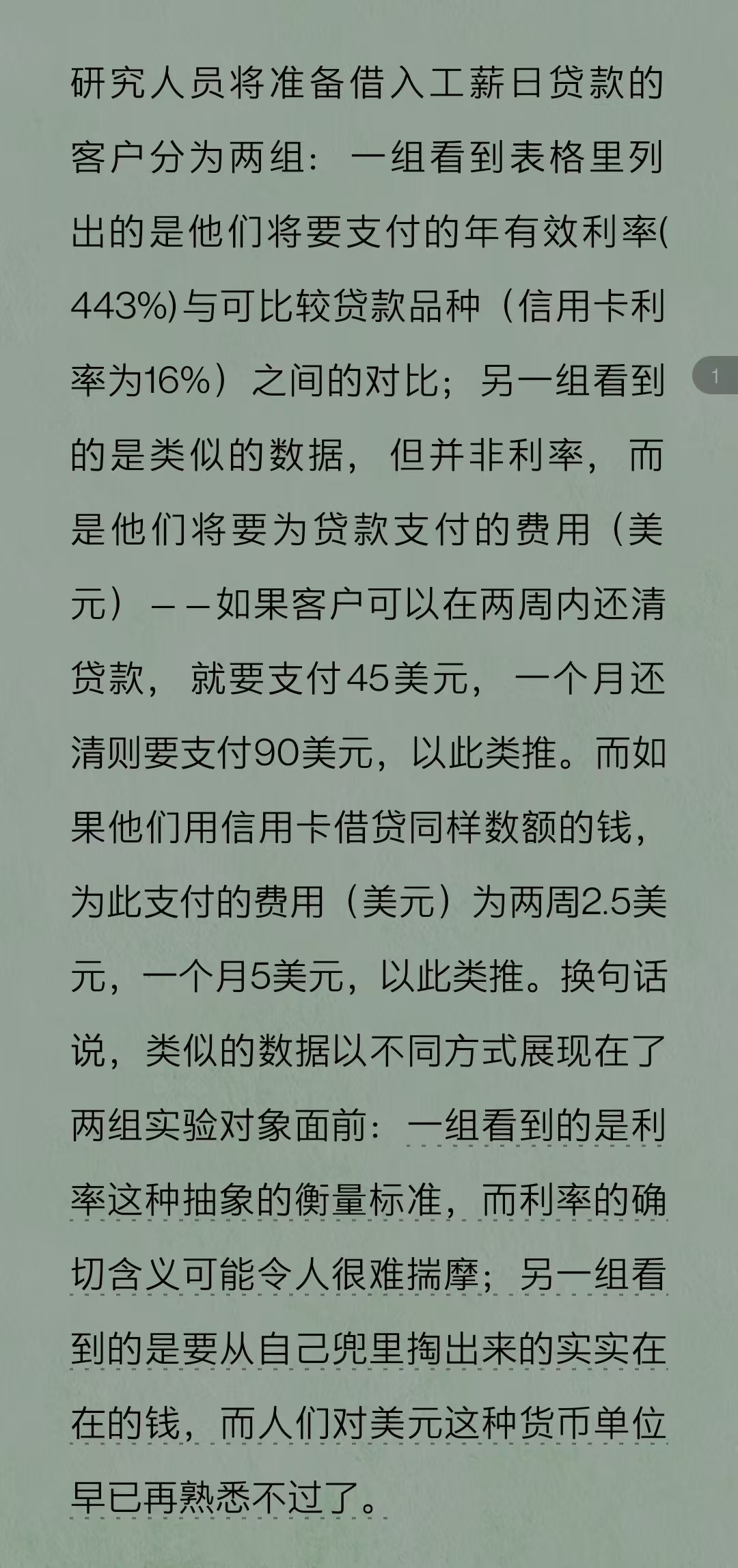 举个书中的例子,有两个贷款产品,一个用利率来表示,看起来很抽象很复杂。一个直接用金额来表示,简洁明了。你会选哪个?