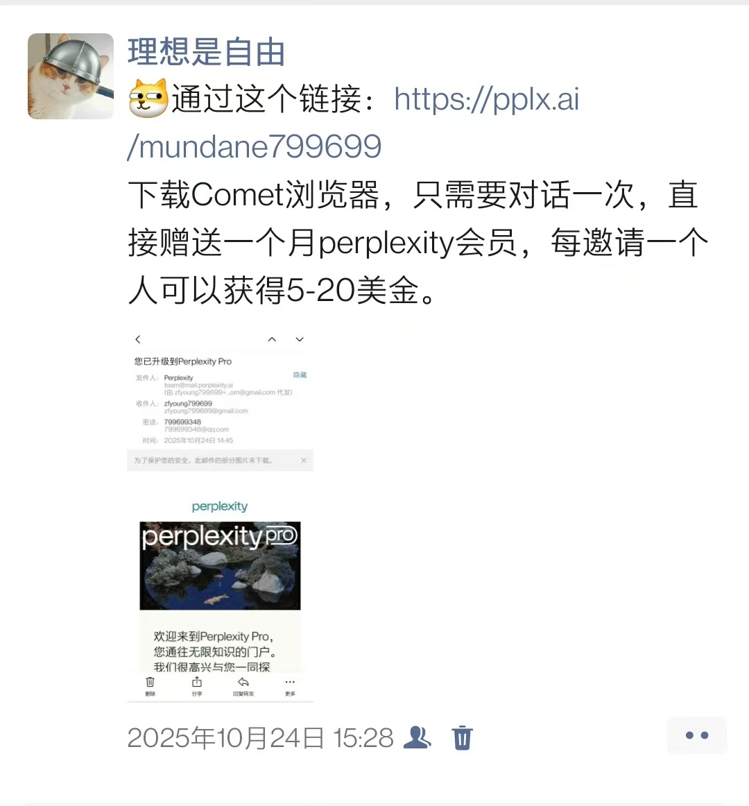 最近pplx公司在推广他的comet浏览器,只要别人通过你的分销链接下载安装了这个浏览器,别人能获得一个月的pplx会员,而你能赚一笔佣金。