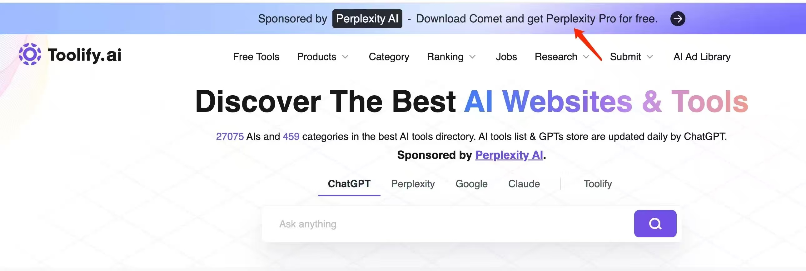 比如著名的导航站toolify它也在网站横幅上挂上了这个推广。