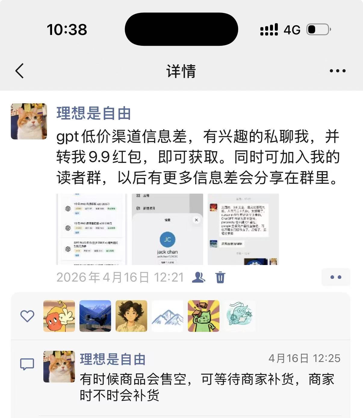 后面看到我的朋友圈有人开始卖gpt代充服务了,而且价格不透明,想知道价格要私聊他。这我就坐不住了,我就想我卖这个信息差不比他有吸引力啊?正好我有个读者群,之前是免费进的,干脆直接把进群改成收费,然后在群里分享信息差得了。而且有些信息,比如如何订阅claude code这种,也只能在私域分享。